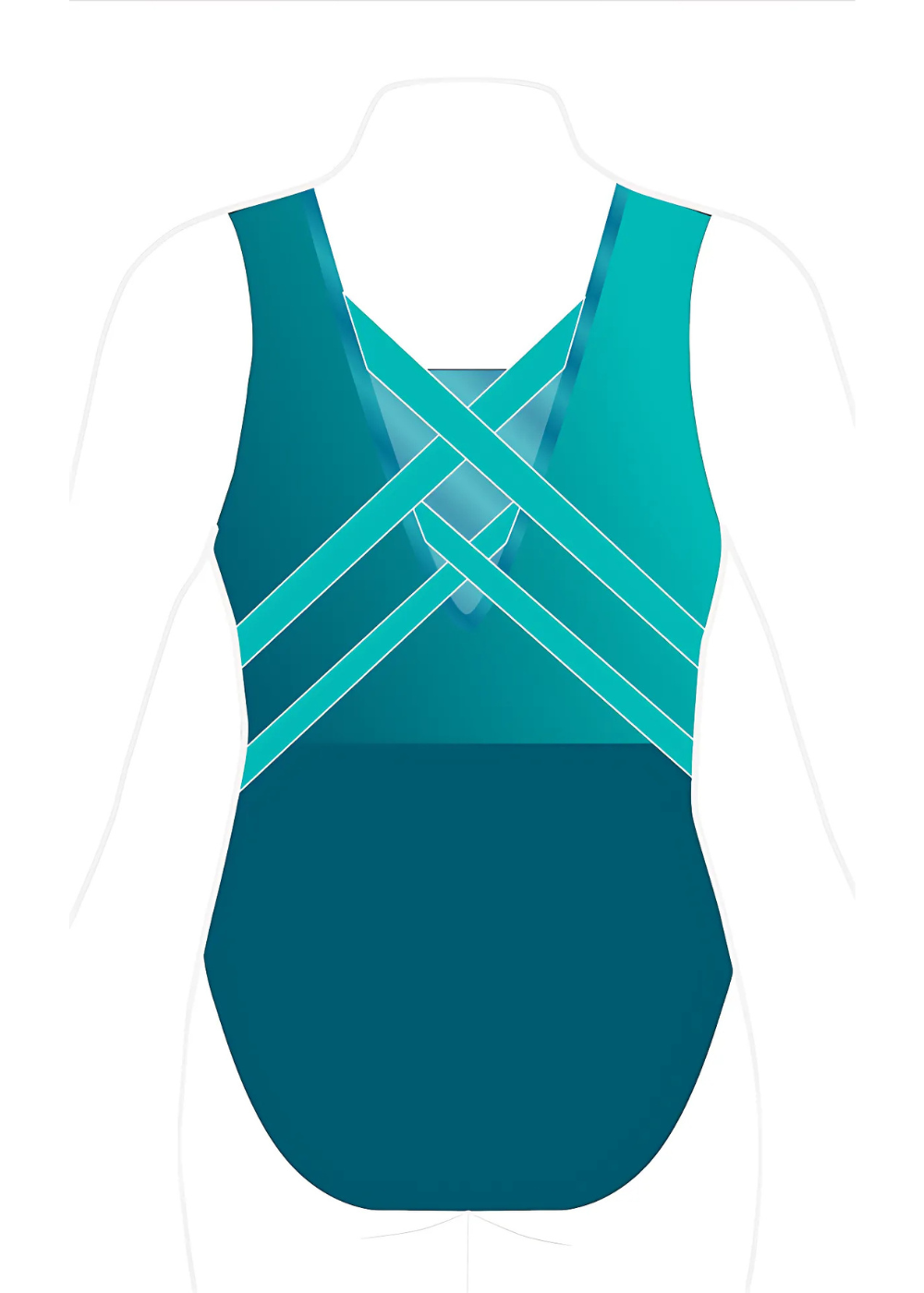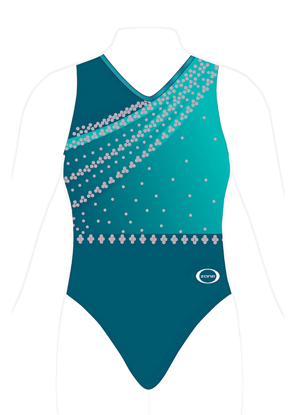 Refreshing and dynamic, Celeste Leotard channels clarity and direction. The bold teal ombré base is elevated by sweeping diagonal lines of crystals, creating the illusion of beams of light in motion. Its modern neckline and clean silhouette ensure a sleek fit that moves effortlessly with the gymnast. It symbolizes fresh energy and determination.