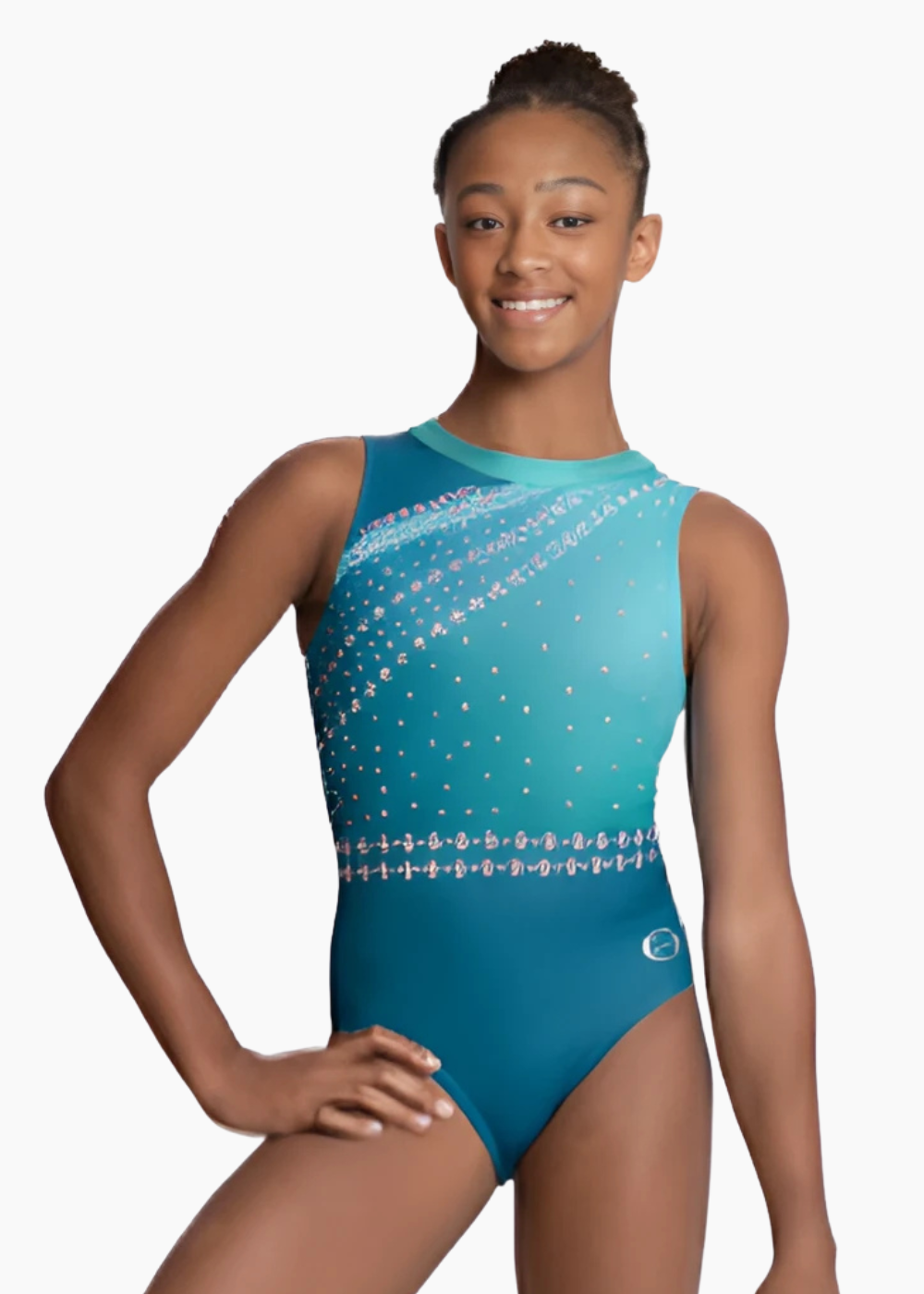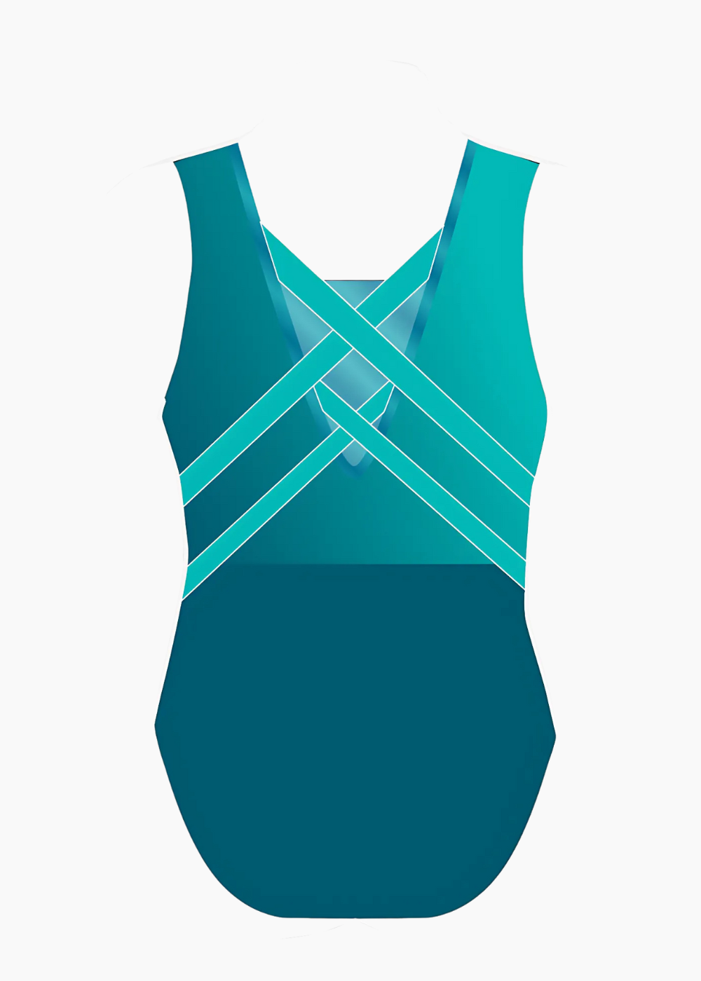 A vibrant teal leotard featuring a rhinestone scatter pattern that creates a teardrop or wave effect on the chest. The back has four thin, high-contrast teal criss-cross straps.