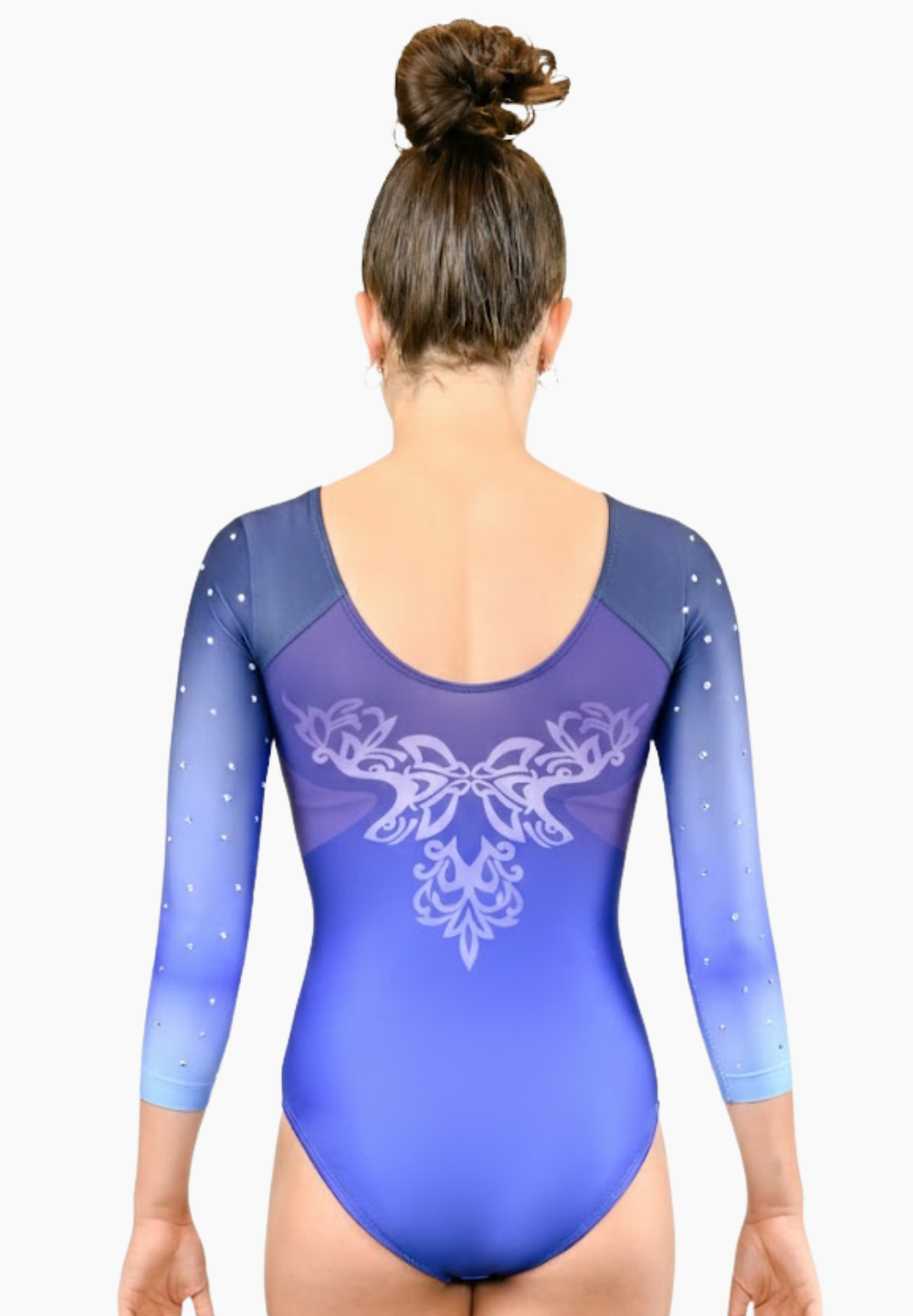 A striking lilac and purple long-sleeve leotard with a sheer mesh yoke. The chest and back are adorned with an intricate white floral scrollwork pattern and heavy rhinestone fringing for a truly regal look.