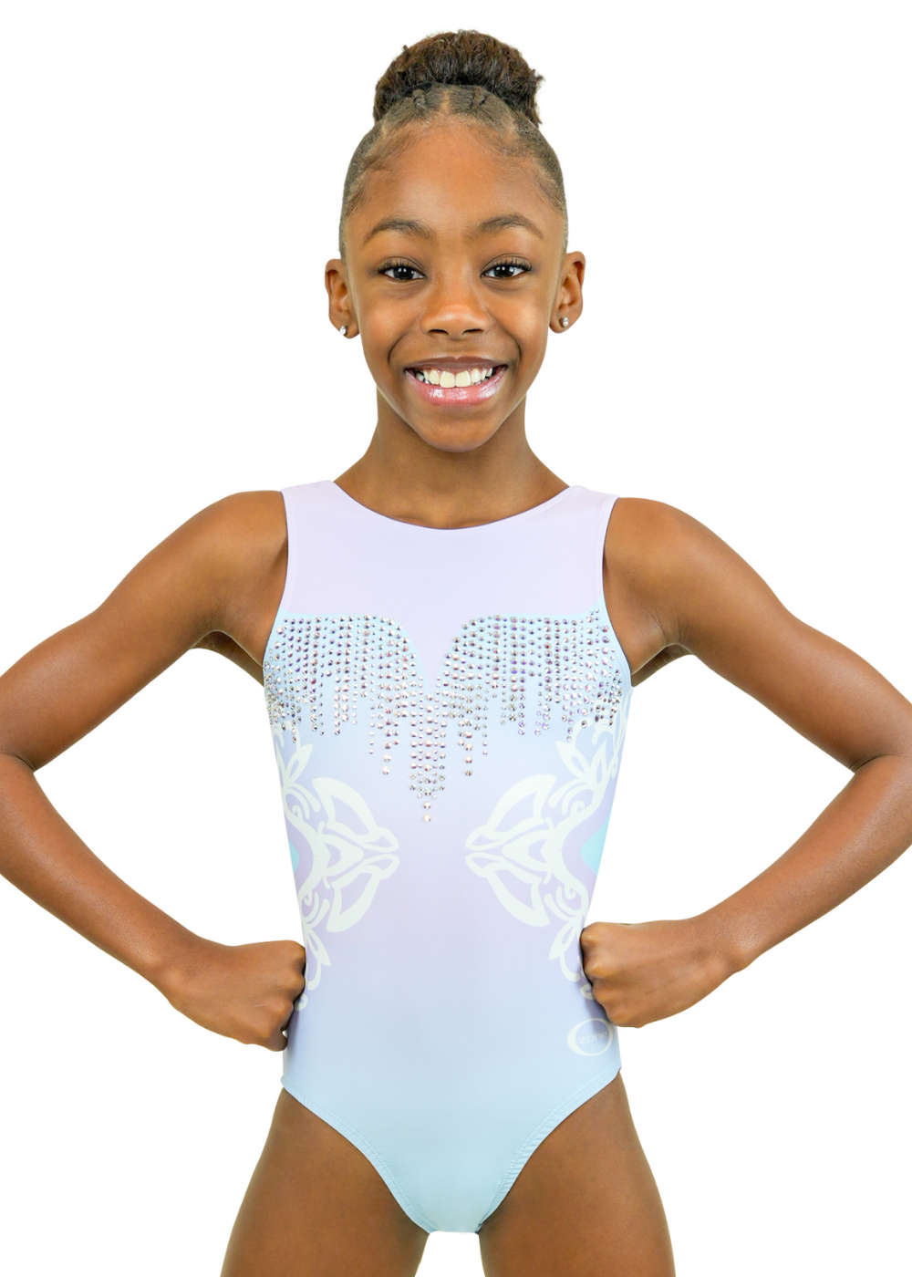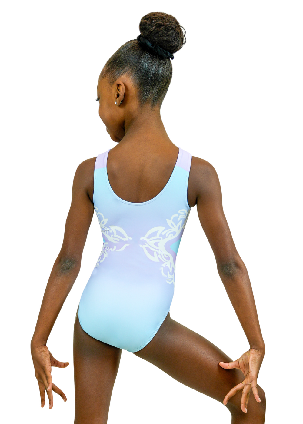 An airy white and light blue ombre leotard, subtly illuminated with a delicate overall sparkle. Designed with simple tank straps and a classic open V-back for comfort.
